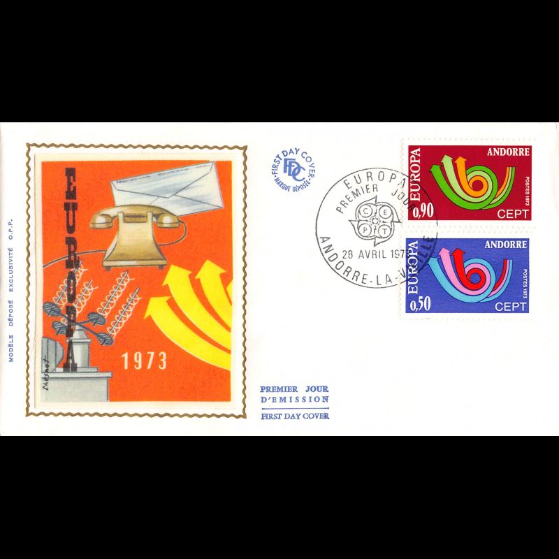 FDC - Enveloppe premier jour d'Andorre Français émise sur l'Année 1973. Nous vous proposons ces produits en différentes finitions (illustration soie ou pas, enveloppes petits et grands formats). En fonction des périodes, ces enveloppes ont été émises par différents éditeurs (Farcigny, CEF, Numismatique Française, Thiaude...) que nous vous proposons dans la mesure du possible.