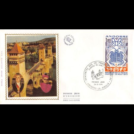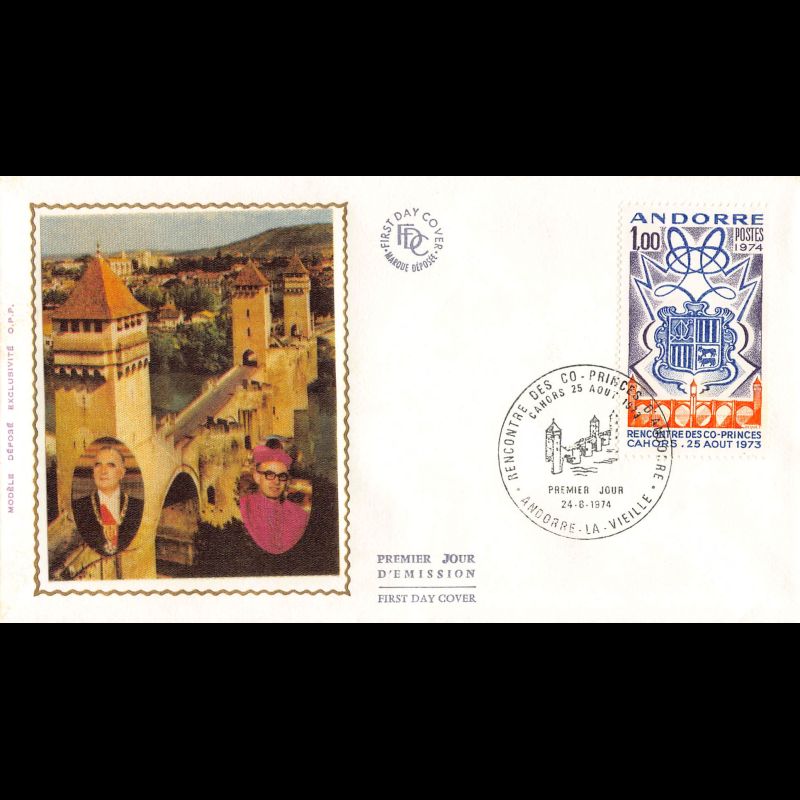 FDC - Enveloppe premier jour d'Andorre Français émise sur l'Année 1974. Nous vous proposons ces produits en différentes finitions (illustration soie ou pas, enveloppes petits et grands formats). En fonction des périodes, ces enveloppes ont été émises par différents éditeurs (Farcigny, CEF, Numismatique Française, Thiaude...) que nous vous proposons dans la mesure du possible.