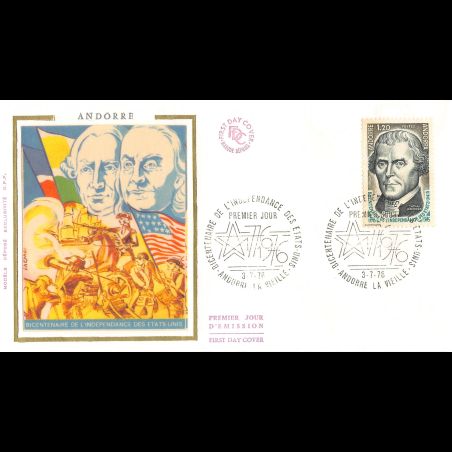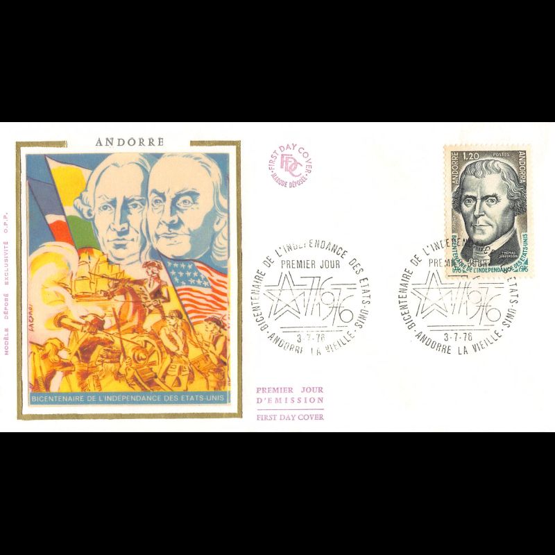 FDC - Enveloppe premier jour d'Andorre Français émise sur l'Année 1976. Nous vous proposons ces produits en différentes finitions (illustration soie ou pas, enveloppes petits et grands formats). En fonction des périodes, ces enveloppes ont été émises par différents éditeurs (Farcigny, CEF, Numismatique Française, Thiaude...) que nous vous proposons dans la mesure du possible.