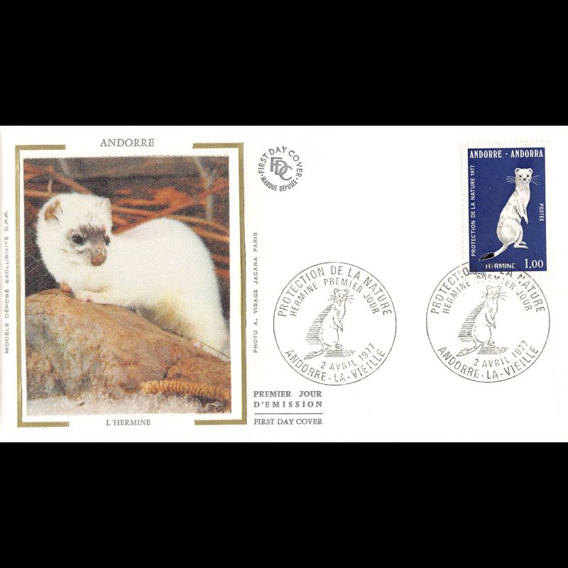 FDC - Enveloppe premier jour d'Andorre Français émise sur l'Année 1977. Nous vous proposons ces produits en différentes finitions (illustration soie ou pas, enveloppes petits et grands formats). En fonction des périodes, ces enveloppes ont été émises par différents éditeurs (Farcigny, CEF, Numismatique Française, Thiaude...) que nous vous proposons dans la mesure du possible.
