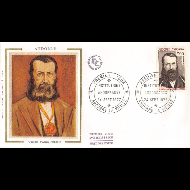 FDC - Enveloppe premier jour d'Andorre Français émise sur l'Année 1977. Nous vous proposons ces produits en différentes finitions (illustration soie ou pas, enveloppes petits et grands formats). En fonction des périodes, ces enveloppes ont été émises par différents éditeurs (Farcigny, CEF, Numismatique Française, Thiaude...) que nous vous proposons dans la mesure du possible.