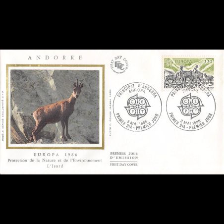 FDC - Enveloppe premier jour d'Andorre Français émise sur l'Année 1986. Nous vous proposons ces produits en différentes finitions (illustration soie ou pas, enveloppes petits et grands formats). En fonction des périodes, ces enveloppes ont été émises par différents éditeurs (Farcigny, CEF, Numismatique Française, Thiaude...) que nous vous proposons dans la mesure du possible.