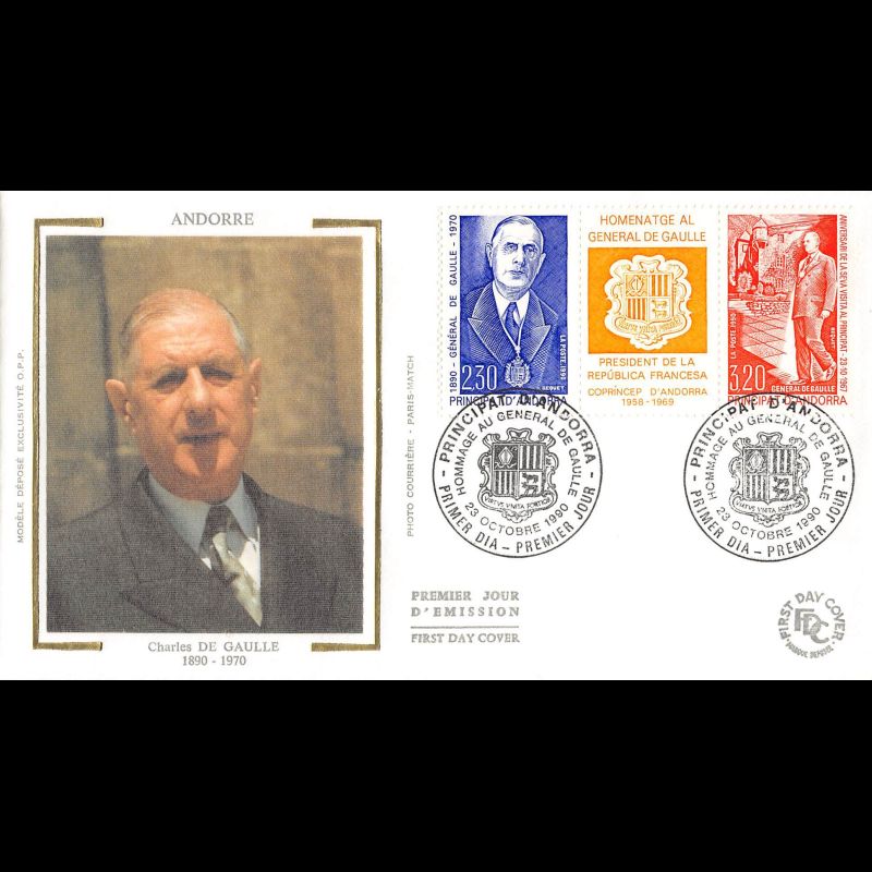 FDC - Enveloppe premier jour d'Andorre Français émise sur l'Année 1990. Nous vous proposons ces produits en différentes finitions (illustration soie ou pas, enveloppes petits et grands formats). En fonction des périodes, ces enveloppes ont été émises par différents éditeurs (Farcigny, CEF, Numismatique Française, Thiaude...) que nous vous proposons dans la mesure du possible.