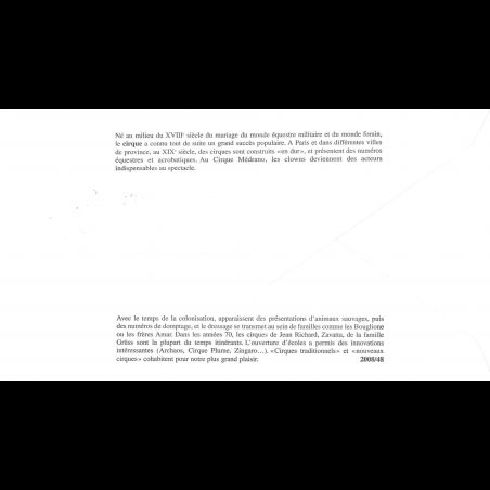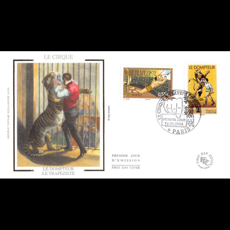 FDC soie - Cirque à travers le temps - Dompteur, trapéziste - obl Paris 15/6/08 - First Day Cover - Enveloppe premier jour de France avec illustration soie.