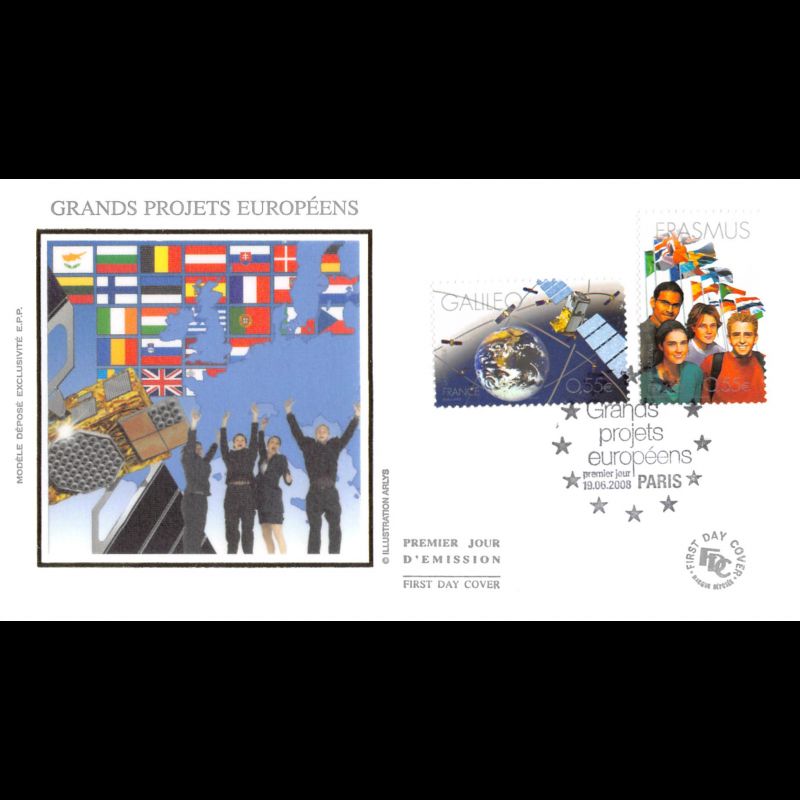 FDC soie - Grands projets européens (env 2 sur 2) - oblit Paris 19/6/08 - First Day Cover - Enveloppe premier jour de France avec illustration soie.