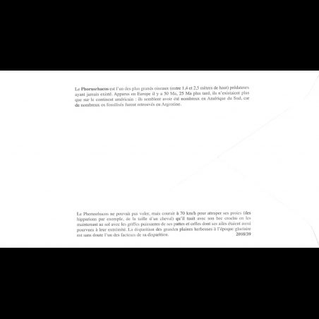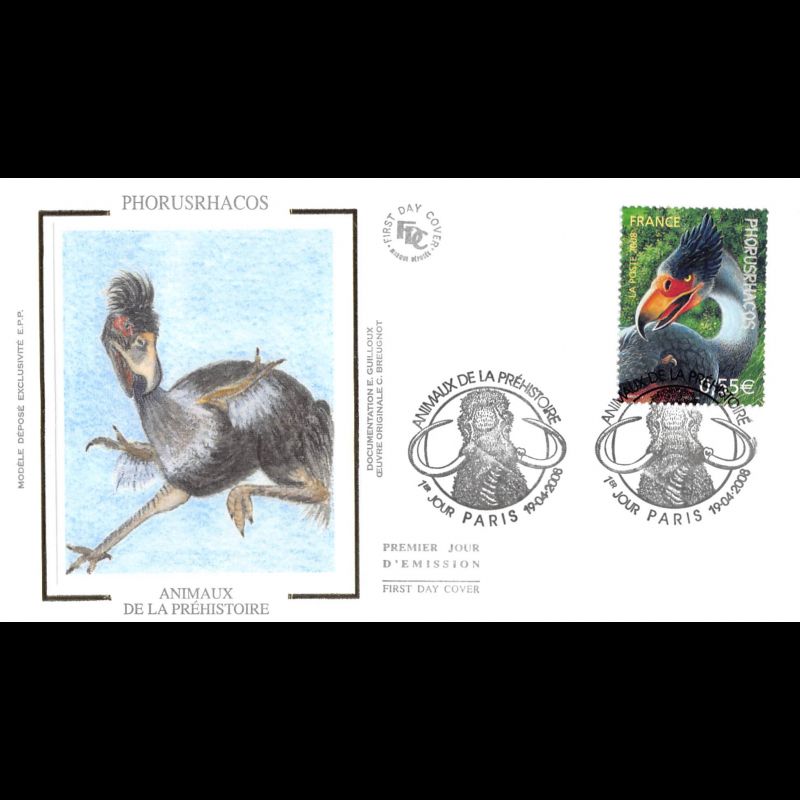 FDC soie - Le Phorusrhacos - 19/4/2008 Paris - First Day Cover - Enveloppe premier jour de France avec illustration soie. Edition Jean Farcigny Dimensions de l'enveloppe : 150 x 90 mm