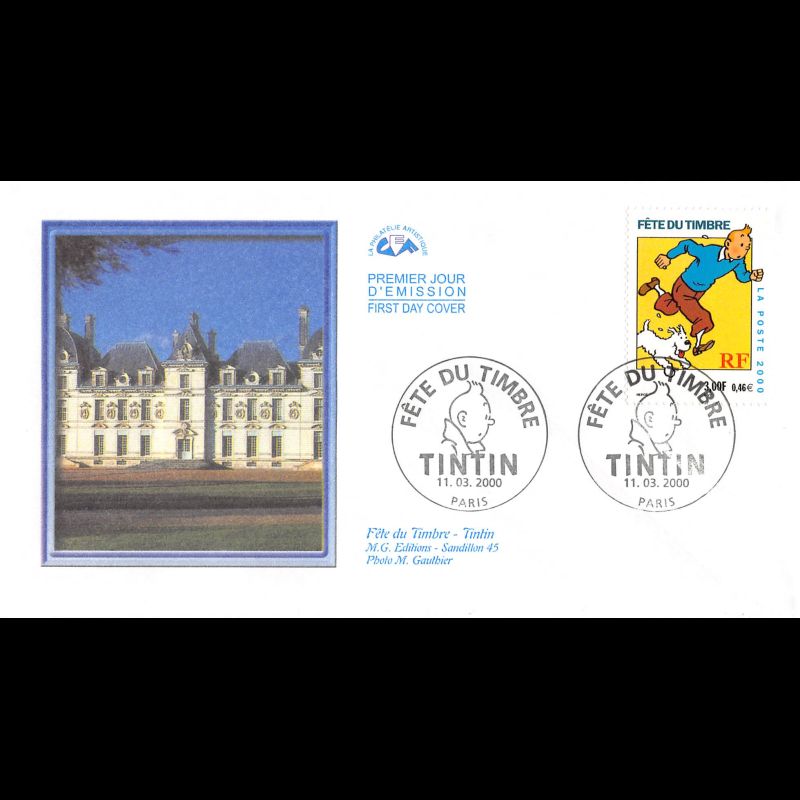 CEF - Tintin, fête du timbre (3303) - 11/3/2000 Paris - First Day Cover - Enveloppe premier jour de France avec illustration soie.