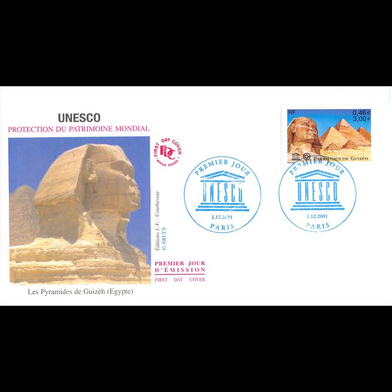 FDC JF - UNESCO - Pyramides de Guizèh - 1/12/2001 Paris - First Day Cover - Enveloppe premier jour de France. Edition Jean Farcigny Dimensions de l'enveloppe : 150 x 90 mm