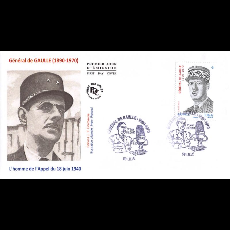 FDC JF - Gal de Gaulle. Appel du 18 juin 1940 - 5/11/2020 Lille - Enveloppe premier jour de France. Edition Jean Farcigny