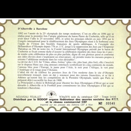Feuillet CEF n° 4s/315 - Série Jeux Olympiques de 1992