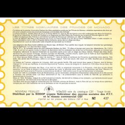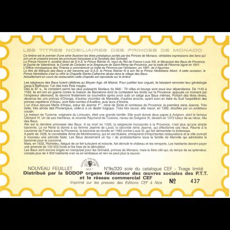 Feuillet CEF de Monaco, livré conforme au scan. Taille 155 x 215 mm. Imprimé sur Papier glacé. Le n° de document suivi d'un "s" signifie que l'illustration est une pièce de soie.