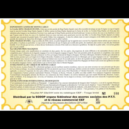 Feuillet CEF de Monaco, livré conforme au scan. Taille 155 x 215 mm. Imprimé sur Papier glacé. Le n° de document suivi d'un "s" signifie que l'illustration est une pièce de soie.