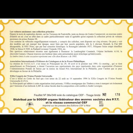 Feuillet CEF de Monaco, livré conforme au scan. Taille 155 x 215 mm. Imprimé sur Papier glacé. Le n° de document suivi d'un "s" signifie que l'illustration est une pièce de soie.