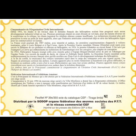 Feuillet CEF de Monaco, livré conforme au scan. Taille 155 x 215 mm. Imprimé sur Papier glacé. Le n° de document suivi d'un "s" signifie que l'illustration est une pièce de soie.