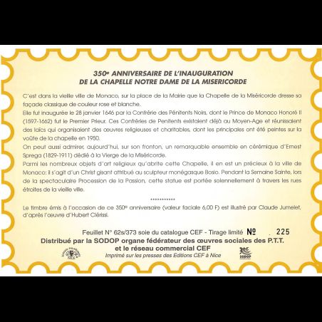 Feuillet CEF de Monaco, livré conforme au scan. Taille 155 x 215 mm. Imprimé sur Papier glacé. Le n° de document suivi d'un "s" signifie que l'illustration est une pièce de soie.