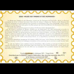 Feuillet CEF de Monaco, livré conforme au scan. Taille 155 x 215 mm. Imprimé sur Papier glacé. Le n° de document suivi d'un "s" signifie que l'illustration est une pièce de soie.