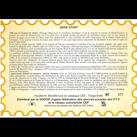 Feuillet CEF de Monaco, livré conforme au scan. Taille 155 x 215 mm. Imprimé sur Papier glacé. Le n° de document suivi d'un "s" signifie que l'illustration est une pièce de soie.