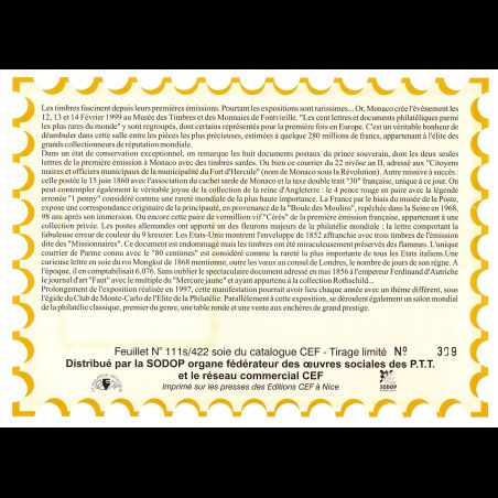 Feuillet CEF de Monaco, livré conforme au scan. Taille 155 x 215 mm. Imprimé sur Papier glacé. Le n° de document suivi d'un "s" signifie que l'illustration est une pièce de soie.