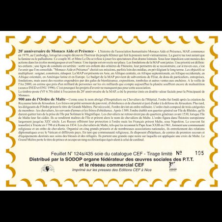 Feuillet CEF de Monaco, livré conforme au scan. Taille 155 x 215 mm. Imprimé sur Papier glacé. Le n° de document suivi d'un "s" signifie que l'illustration est une pièce de soie.