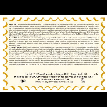 Feuillet CEF de Monaco, livré conforme au scan. Taille 155 x 215 mm. Imprimé sur Papier glacé. Le n° de document suivi d'un "s" signifie que l'illustration est une pièce de soie.