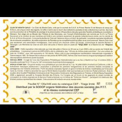 Feuillet CEF de Monaco, livré conforme au scan. Taille 155 x 215 mm. Imprimé sur Papier glacé. Le n° de document suivi d'un "s" signifie que l'illustration est une pièce de soie.