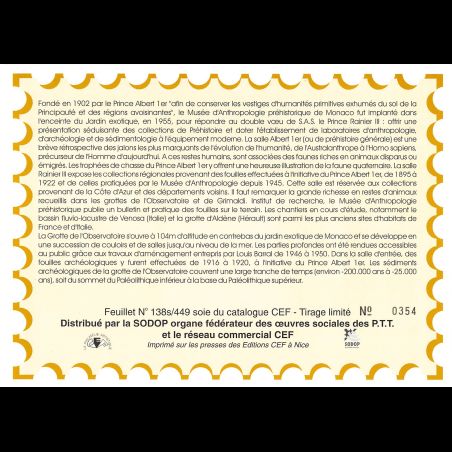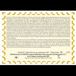 Feuillet CEF de Monaco, livré conforme au scan. Taille 155 x 215 mm. Imprimé sur Papier glacé. Le n° de document suivi d'un "s" signifie que l'illustration est une pièce de soie.
