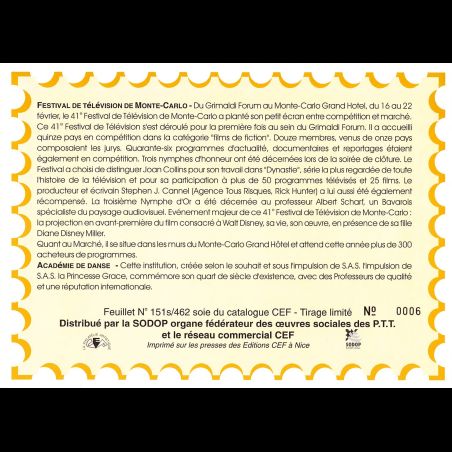 Feuillet CEF de Monaco, livré conforme au scan. Taille 155 x 215 mm. Imprimé sur Papier glacé. Le n° de document suivi d'un "s" signifie que l'illustration est une pièce de soie.