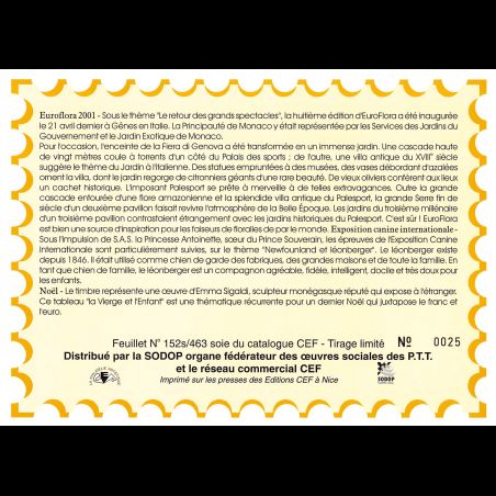 Feuillet CEF de Monaco, livré conforme au scan. Taille 155 x 215 mm. Imprimé sur Papier glacé. Le n° de document suivi d'un "s" signifie que l'illustration est une pièce de soie.