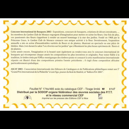 Feuillet CEF de Monaco, livré conforme au scan. Taille 155 x 215 mm. Imprimé sur Papier glacé. Le n° de document suivi d'un "s" signifie que l'illustration est une pièce de soie.
