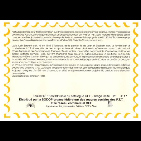Feuillet CEF de Monaco, livré conforme au scan. Taille 155 x 215 mm. Imprimé sur Papier glacé. Le n° de document suivi d'un "s" signifie que l'illustration est une pièce de soie.