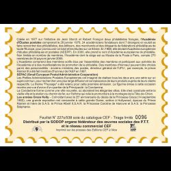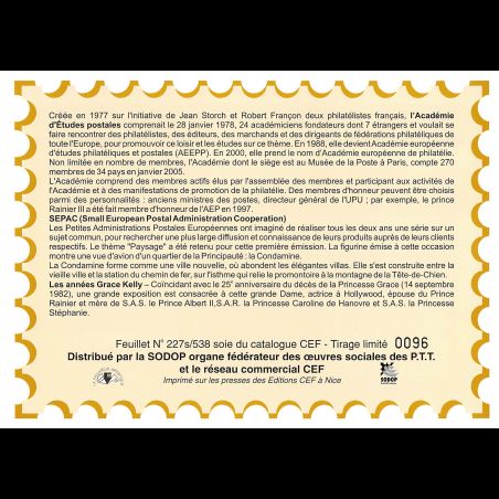 Feuillet CEF de Monaco, livré conforme au scan. Taille 155 x 215 mm. Imprimé sur Papier glacé. Le n° de document suivi d'un "s" signifie que l'illustration est une pièce de soie.