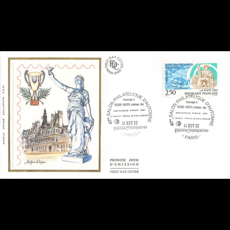FDC soie - FDC soie - Cours constitutionnelles européennes - 14/11/1993 Salon Paris - First Day Cover - Enveloppe premier jour de France avec illustration soie. Edition Jean Farcigny Dimensions de l'enveloppe : 150 x 90 mm