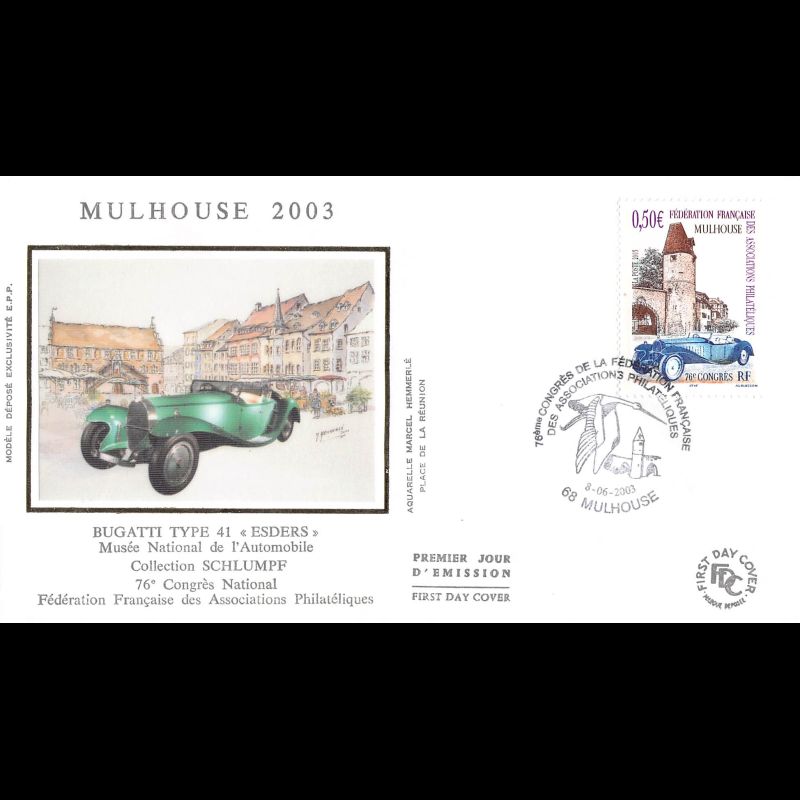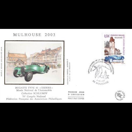 FDC soie - Congrès de la FFAP - 6/6/2003 ill. congrès Mulhouse - First Day Cover - Enveloppe premier jour de France avec illustration soie. Edition Jean Farcigny Dimensions de l'enveloppe : 150 x 90 mm