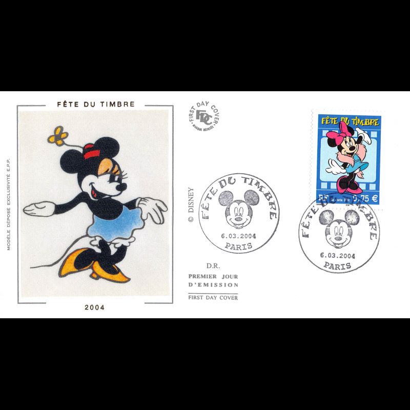 FDC soie - Fête du timbre. Minnie - 6/3/2004 Paris - First Day Cover - Enveloppe premier jour de France avec illustration soie. Edition Jean Farcigny Dimensions de l'enveloppe : 150 x 90 mm