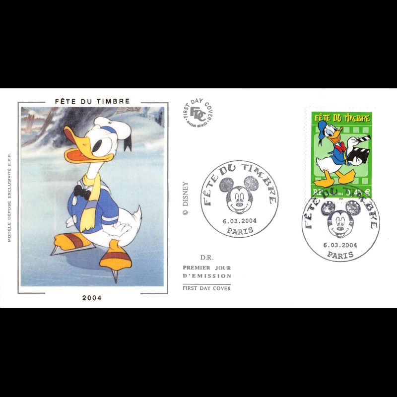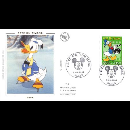 FDC soie - Fête du timbre. Donald - 6/3/2004 Paris - First Day Cover - Enveloppe premier jour de France avec illustration soie. Edition Jean Farcigny Dimensions de l'enveloppe : 150 x 90 mm