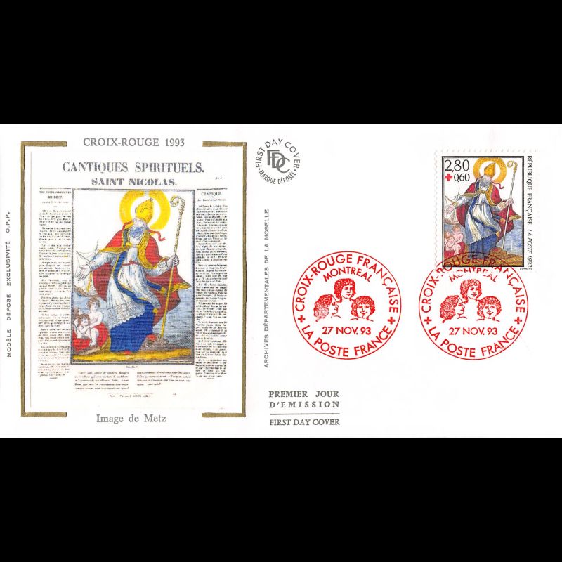 FDC soie - Croix rouge. Saint-Nicolas - 27/11/1993 Montréal - First Day Cover - Enveloppe premier jour de France avec illustration soie. Edition Jean Farcigny Dimensions de l'enveloppe : 150 x 90 mm