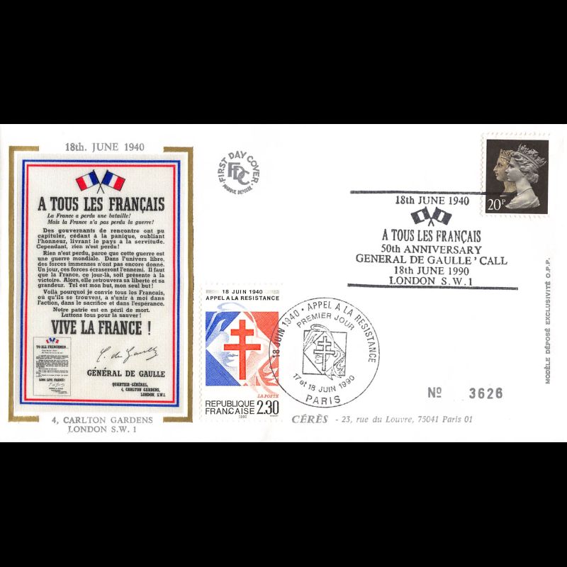 FDC soie - Appel du 18 juin - Env. mixte - oblit Paris et Londres - First Day Cover - Enveloppe premier jour de France avec illustration soie. Edition Jean Farcigny Dimensions de l'enveloppe : 150 x 90 mm
