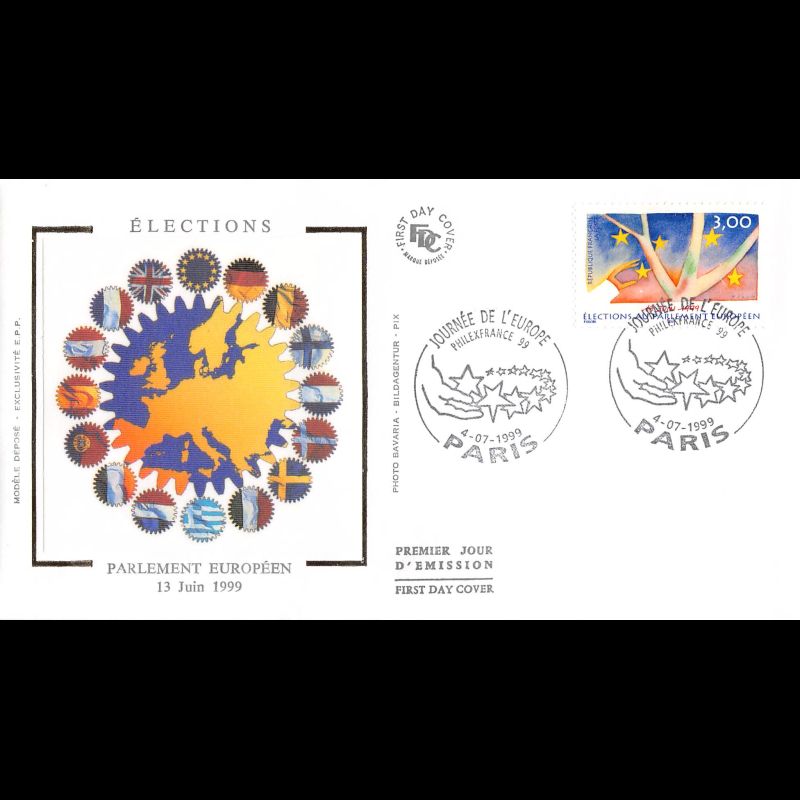 FDC soie - Parlement européen. Journée de l'europe - 4/7/1999 Paris - First Day Cover - Enveloppe premier jour de France avec illustration soie. Edition Jean Farcigny Dimensions de l'enveloppe : 150 x 90 mm
