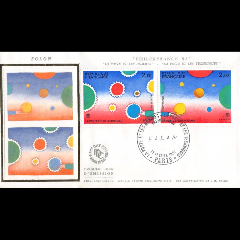 FDC soie - Philexfrance 82. Oeuvre de J.-M. Folon (env 3 sur 3) - 13/2/1982 Paris - First Day Cover - Enveloppe premier jour de France. Edition Jean Farcigny Dimensions de l'enveloppe : 150 x 90 mm