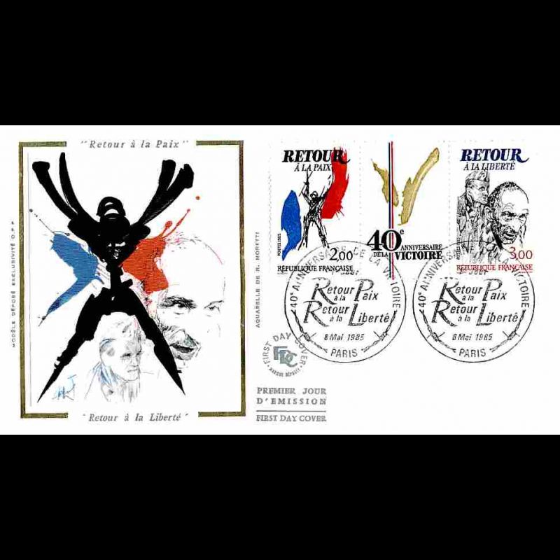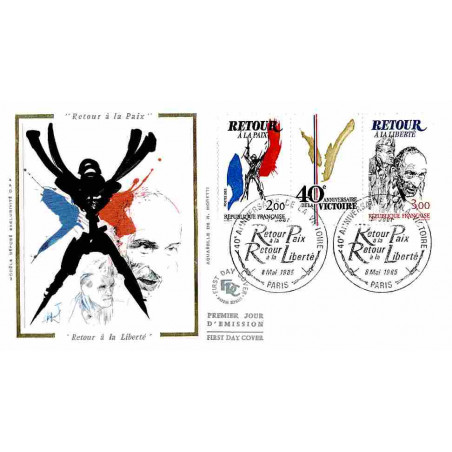 FDC soie - 40e anniversaire de la Victoire - 8/5/1985 Paris - First Day Cover - Enveloppe premier jour de France avec illustration soie.