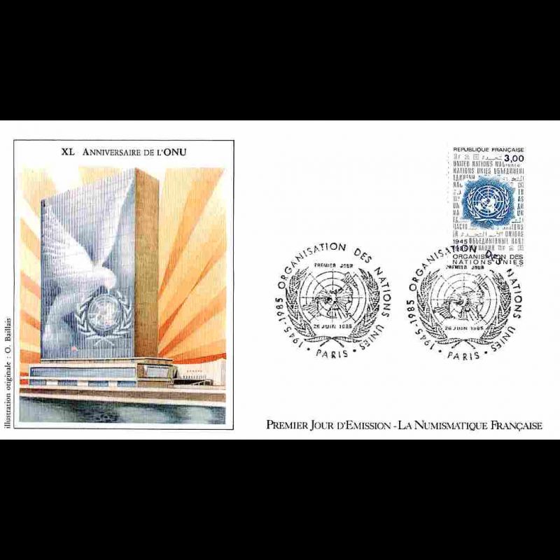 FDC LNF - 40e anniversaire de l'ONU - 26/6/1985 Paris - First Day Cover - Enveloppe premier jour de France. Edition La Numismatique Française Dimensions de l'enveloppe : 175 x 100 mm