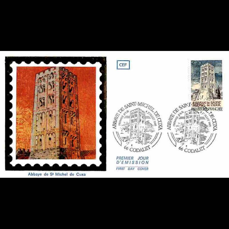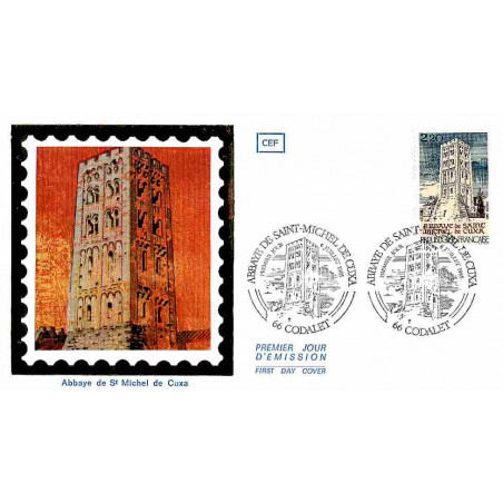 CEF soie - Abbaye Saint Michel de Cuxa - 6/7/1985 Codalet - First Day Cover - Enveloppe premier jour de France avec illustration soie.