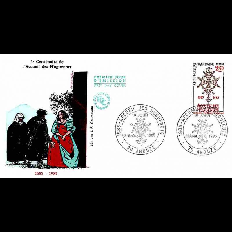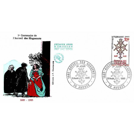 FDC JF - Accueil des Huguenots - 31/8/1985 Anduze - First Day Cover - Enveloppe premier jour de France. Edition Jean Farcigny Dimensions de l'enveloppe : 150 x 90 mm