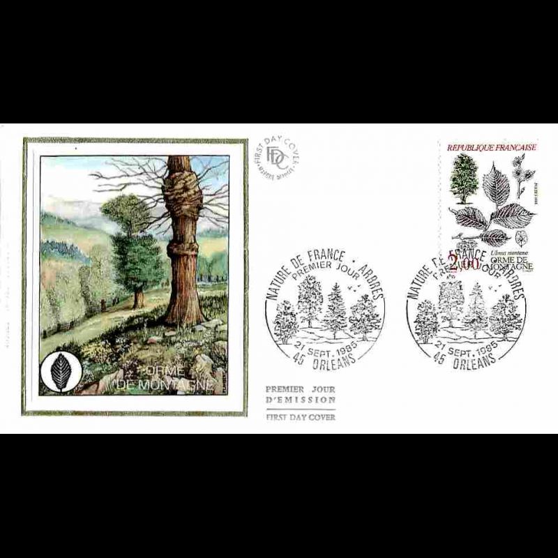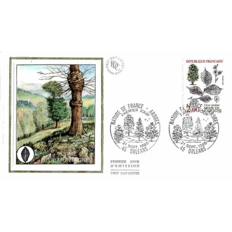 FDC soie - Protection de la nature, Orme de Montagne - 21/9/1985 Orléans - First Day Cover - Enveloppe premier jour de France avec illustration soie.