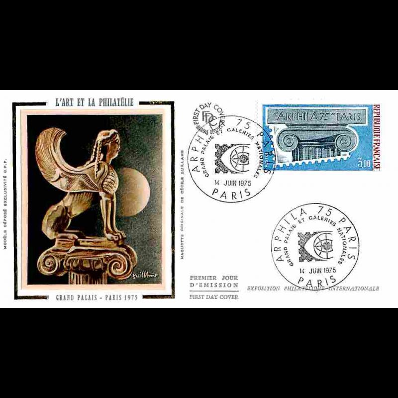 FDC soie - Arphila 75, grand Palais (1835) - oblit spéc ill Paris 14/6/1975 - First Day Cover - Enveloppe premier jour de France avec illustration soie.