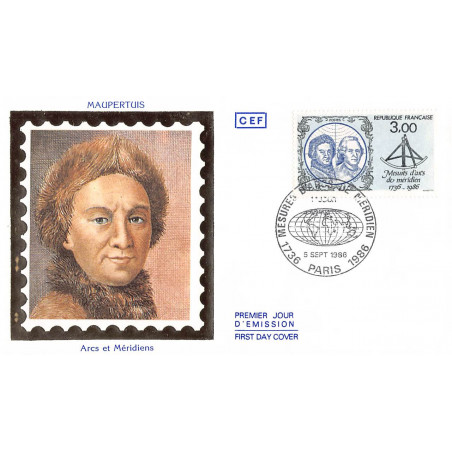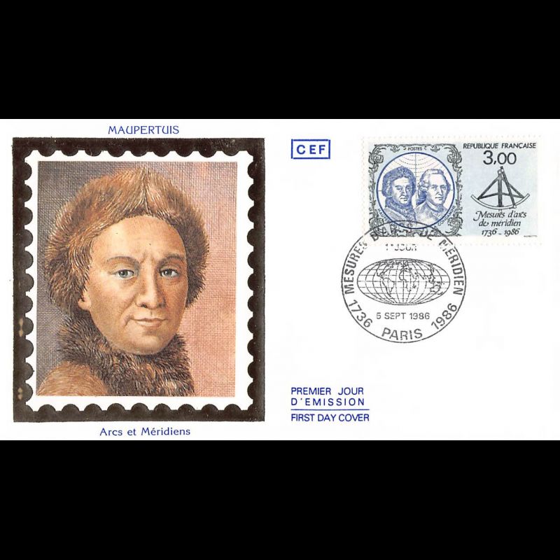CEF soie - Mesures d'Arcs de Méridien, Paris 5/9/86 - First Day Cover - Enveloppe premier jour de France avec illustration soie.