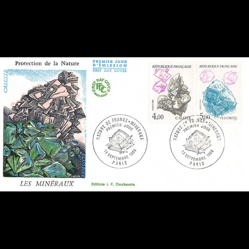 FDC JF - Minéraux - Calcite - Fluorite, Paris 13/9/86 - First Day Cover - Enveloppe premier jour de France. Edition Jean Farcigny Dimensions de l'enveloppe : 150 x 90 mm