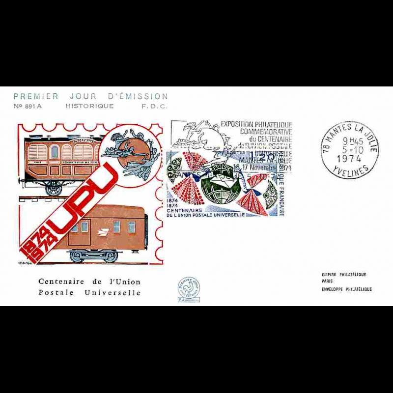 FDC n° 891A - Centenaire de l'UPU - 5/10/1974 Mantes la jolie + flamme
