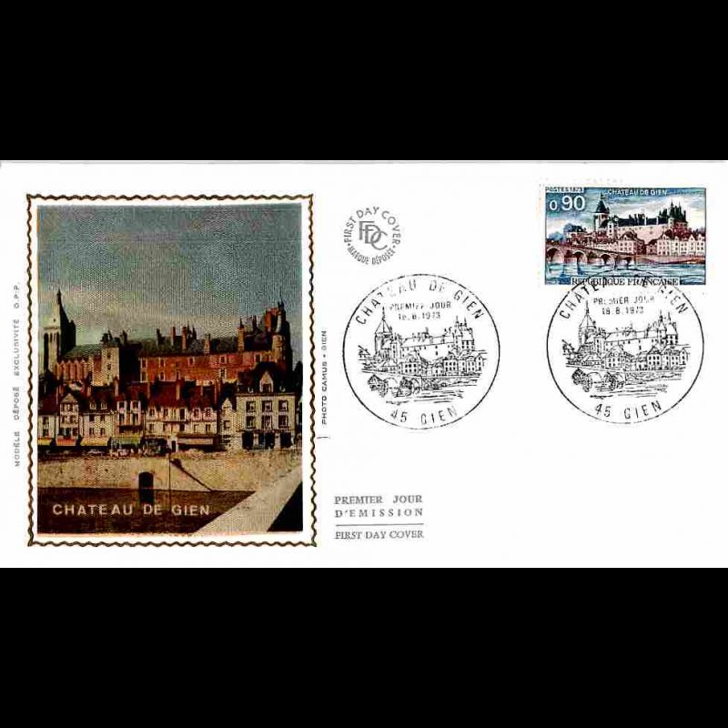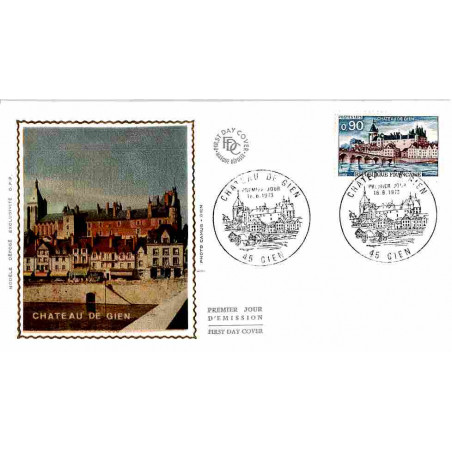 FDC soie - Gien - Le château et le pont - 18/8/1973 Gien - First Day Cover - Enveloppe premier jour de France avec illustration soie.
