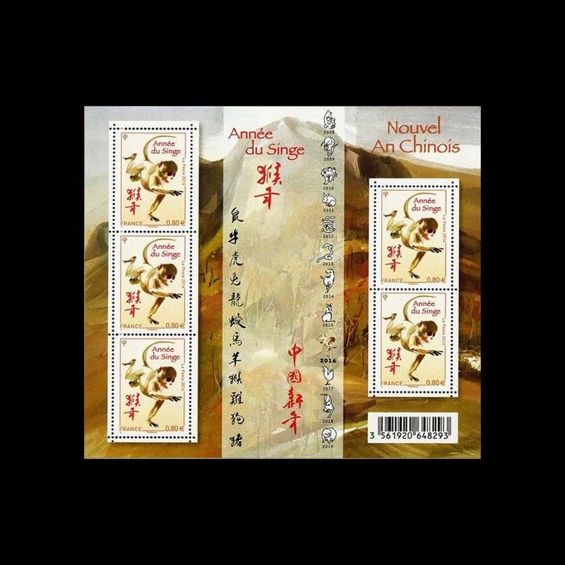 Année lunaire chinoise du Singe. Nouvel an chinois. 2 bandes de phosphore. La petite feuille de 5 timbres.
